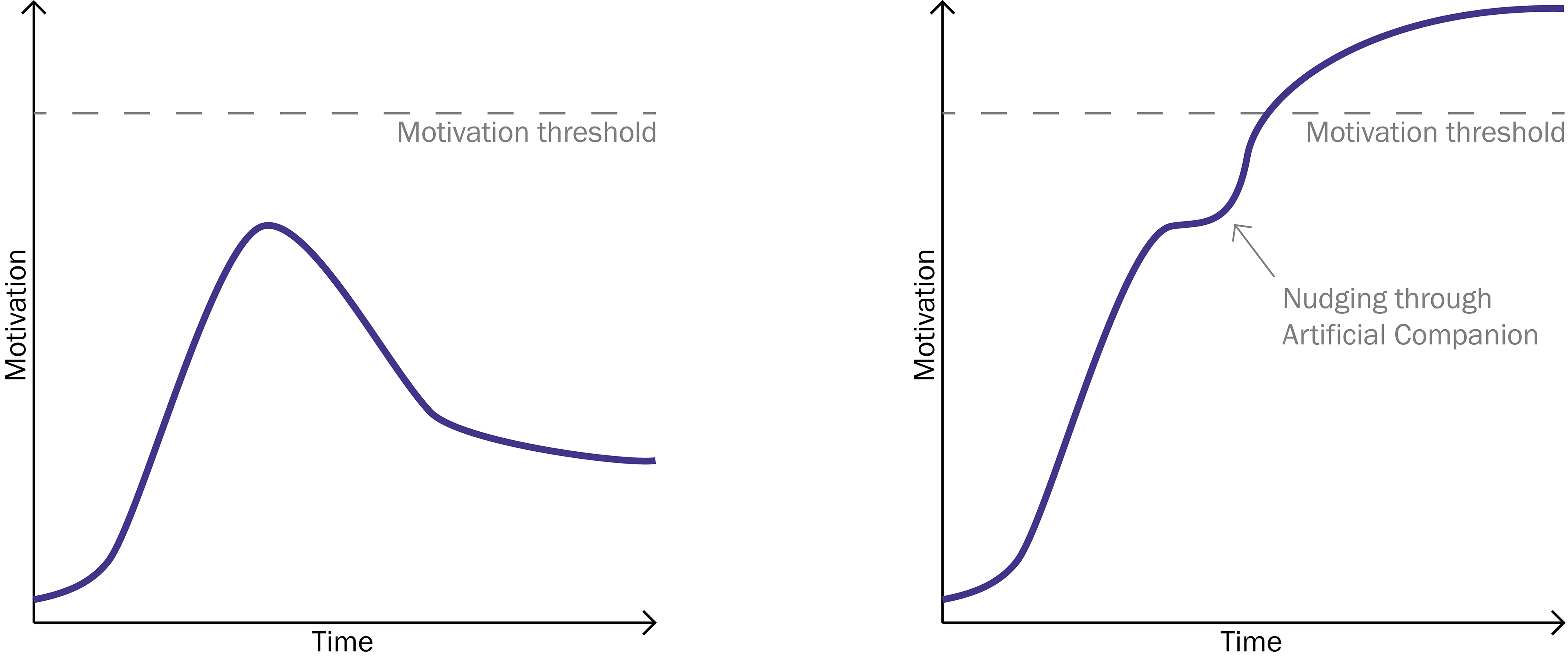 With the Artificial Companion System, the user is given a little nudge in certain situations to help overcome the motivation threshold. He consciously feels the increased impulse of motivation and can still decide whether he wants to act or not.